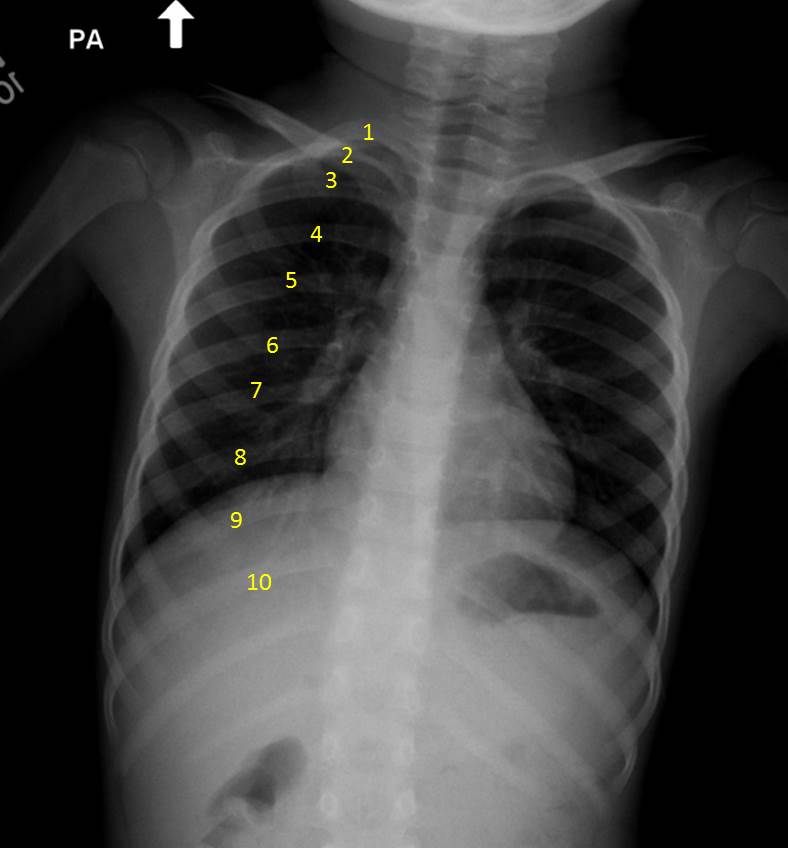 The right posterior ribs are numbered. The right diaphragm is nearly even with the 8